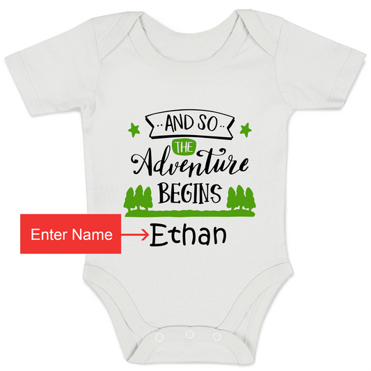 Personalized Organic Baby Bodysuit - Adventure Begins (White / Short Sleeve)