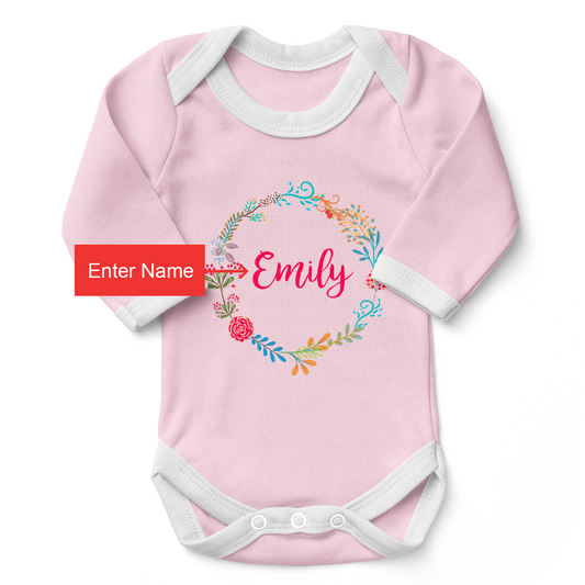 Personalized Organic Baby Bodysuit - Floral Round (Pink / Long Sleeve)