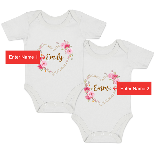 Personalized Organic Baby Bodysuit Set - TWIN Flower Love (White & White)