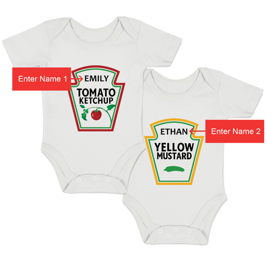 Personalized Organic Baby Bodysuit Set - TWIN Ketchup (White & White)