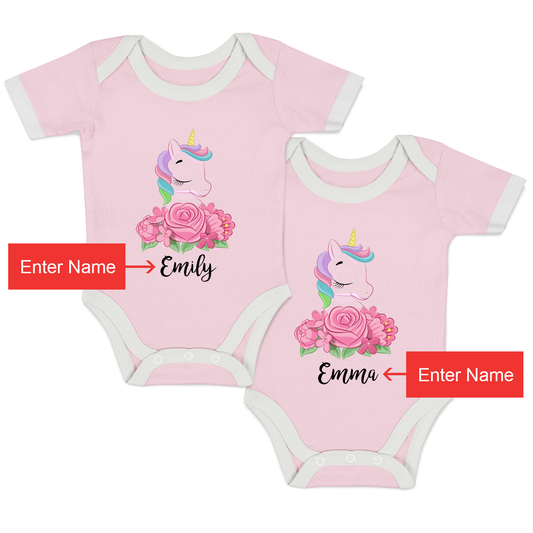 Personalized Organic Baby Bodysuit Set - TWIN Unicorns (Pink & Pink)