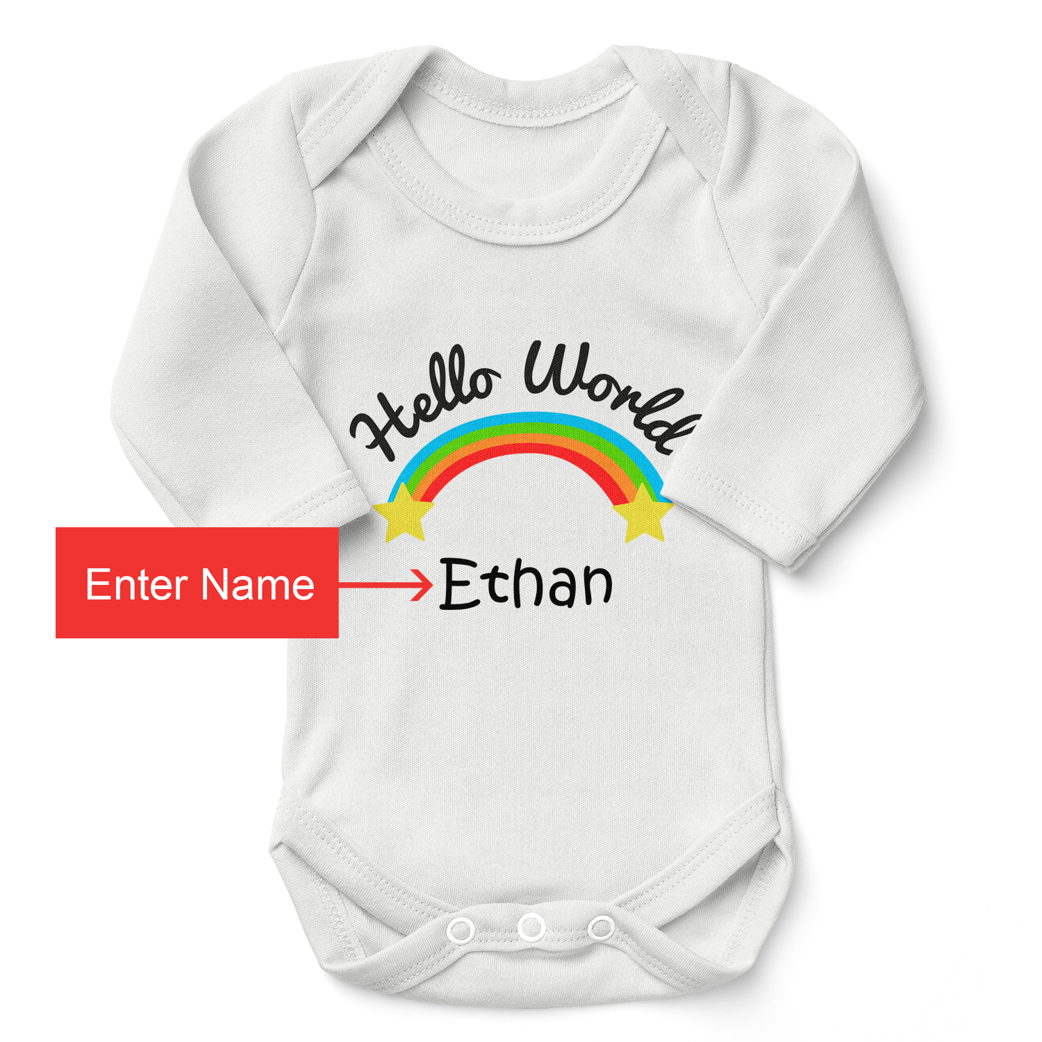 Personalized Organic Baby Bodysuit Set - TWIN Hello World (White & White)