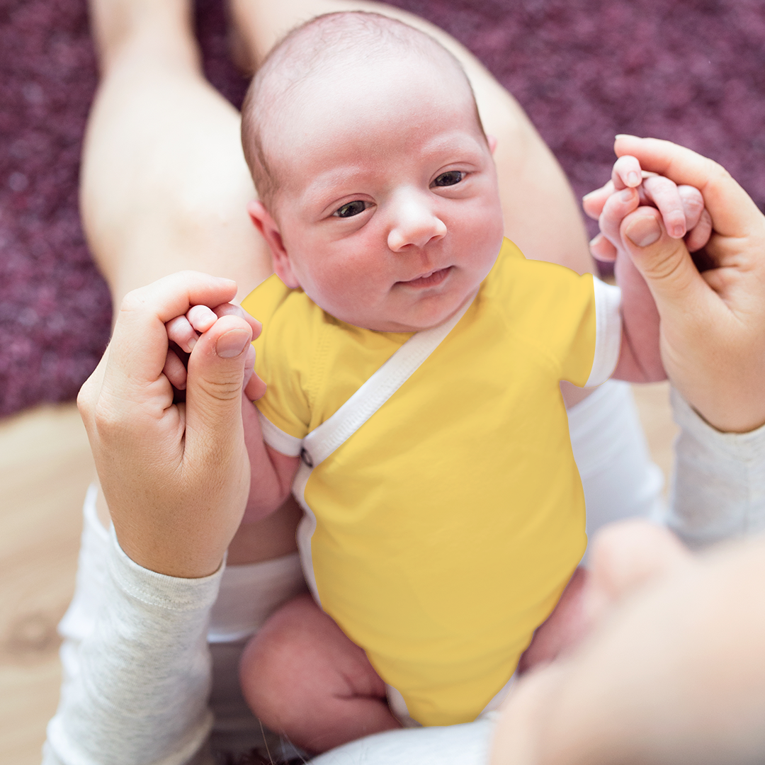 Personalized with Baby's name and number (backside) and Team name (frontside). This finest Baby bodysuit is made from soft and premium organic cotton with luxurious feel. Azo-free dyes and eco-friendly water-based inks. - Endanzoo Organic Short Sleeve Kimono Bodysuit - Yellow