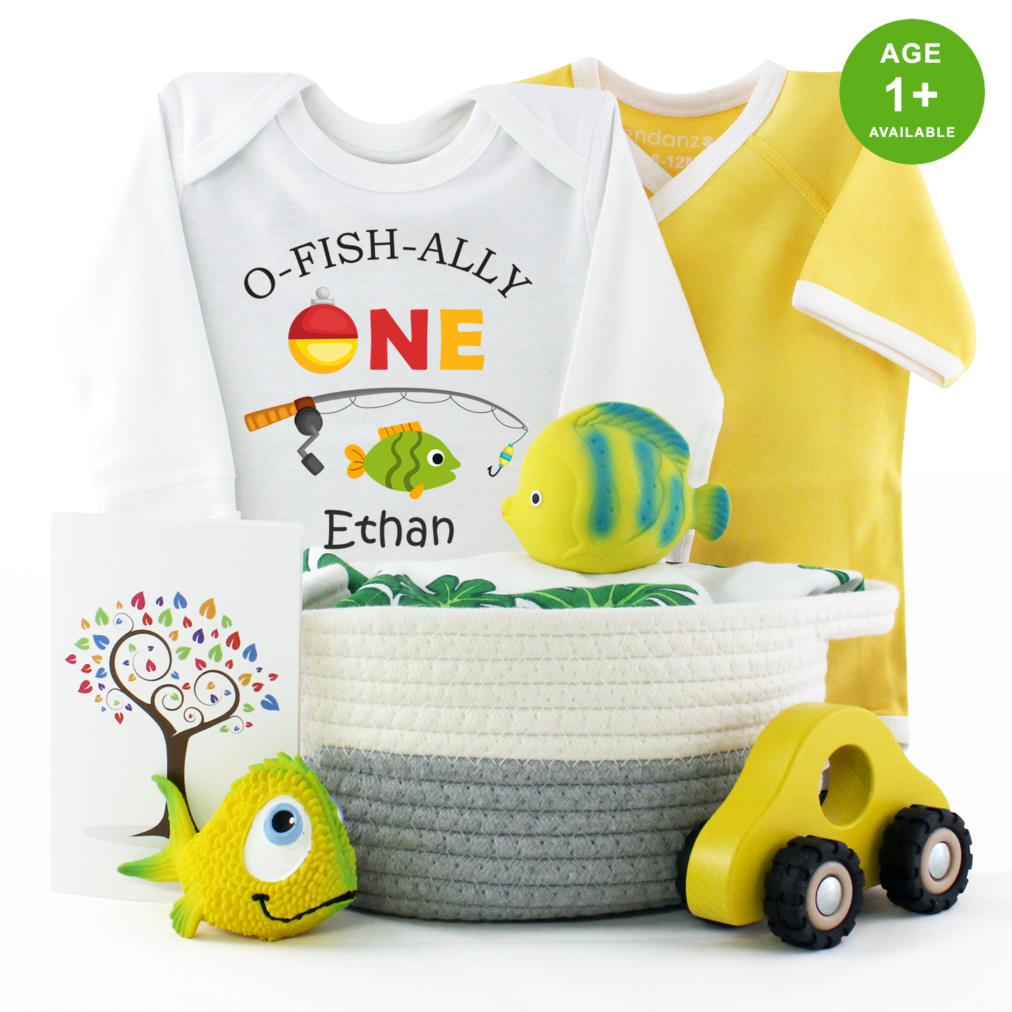 Make a splash with the O-fish-ally ONE birthday gift basket! Includes a personalized sporty bodysuit, cozy organic outfits in cheerful yellow tones, and essentials for your little one's big day. Eco-wrapped and packed in a reusable cotton rope basket — fun, thoughtful, and zero waste!