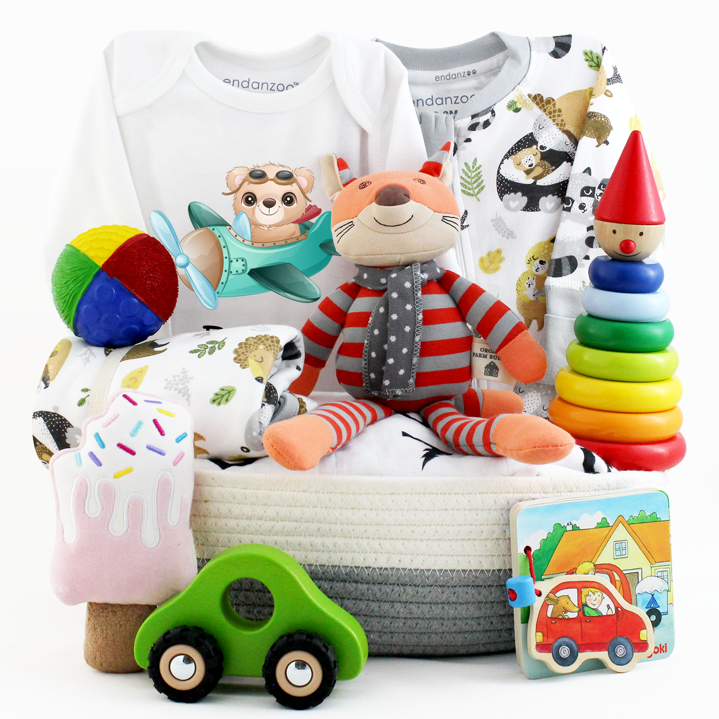 Ready for takeoff into cuteness! This dreamy gift basket has everything for baby’s first holiday — soft organic outfits, travel-ready toys, and sweet personalized touches. Snuggles, smiles, and sustainability included!
