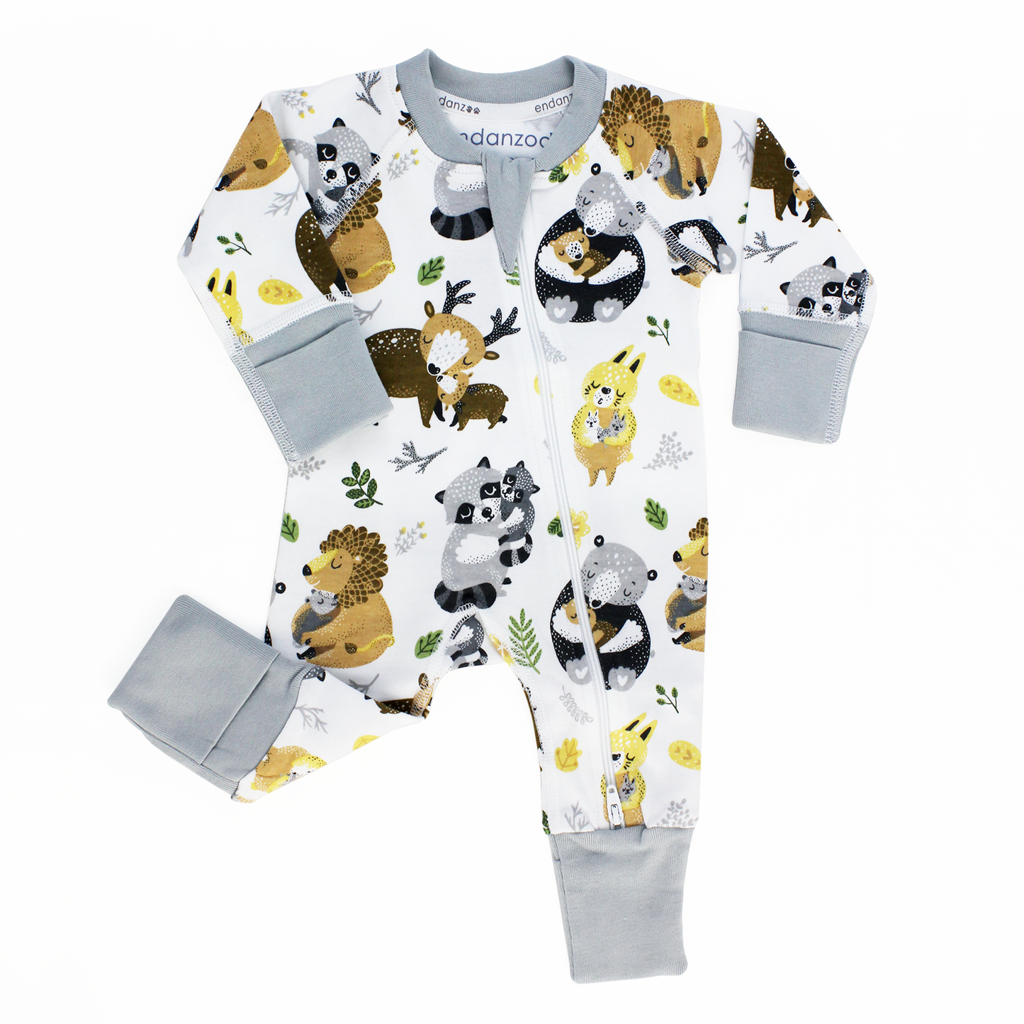 Personalized with Baby's Name. This organic blankie is ultra soft and great for babies to hug. It's GOTS certified organic cotton, low impact fabric dye and the filler is 100% naturally hypoallergenic corn fiber. - Endanzoo Classic Snuggle Organic Double Zippered Romper - Safari Hugs