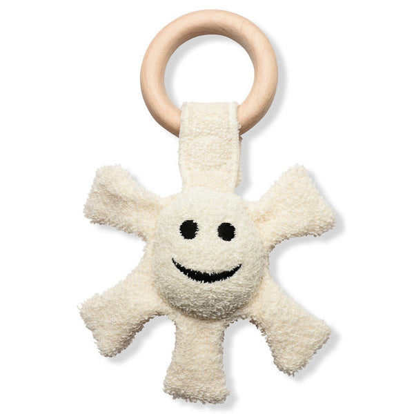 Made with organic cotton. It gently rattles with a little shake. The filler is 100% naturally hypoallergenic corn fiber. - Heimess Wooden Rattles - Touch Ring Sun
